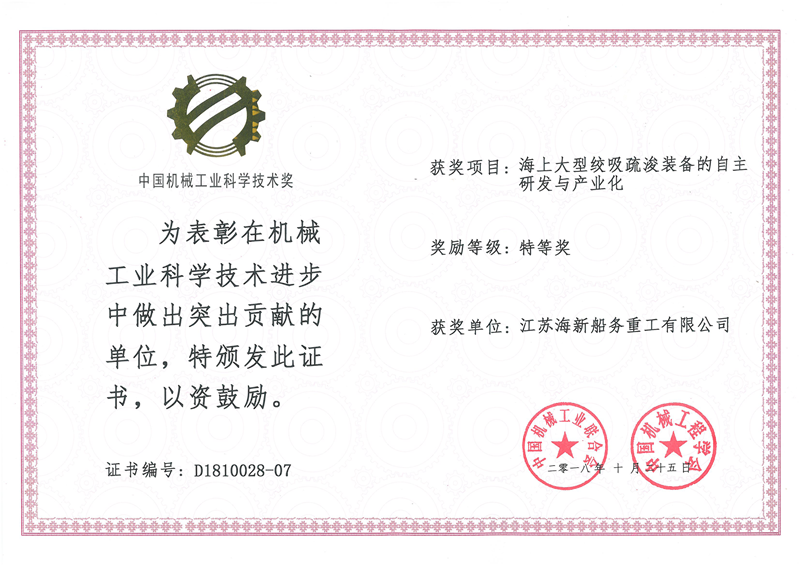 日期:2018-11-07 03:19:51 作者:熱烈慶祝海新重工榮獲中國(guó)機(jī)械工業(yè)科學(xué)技術(shù)特等獎(jiǎng)-江蘇海宏建設(shè)工程有限公司